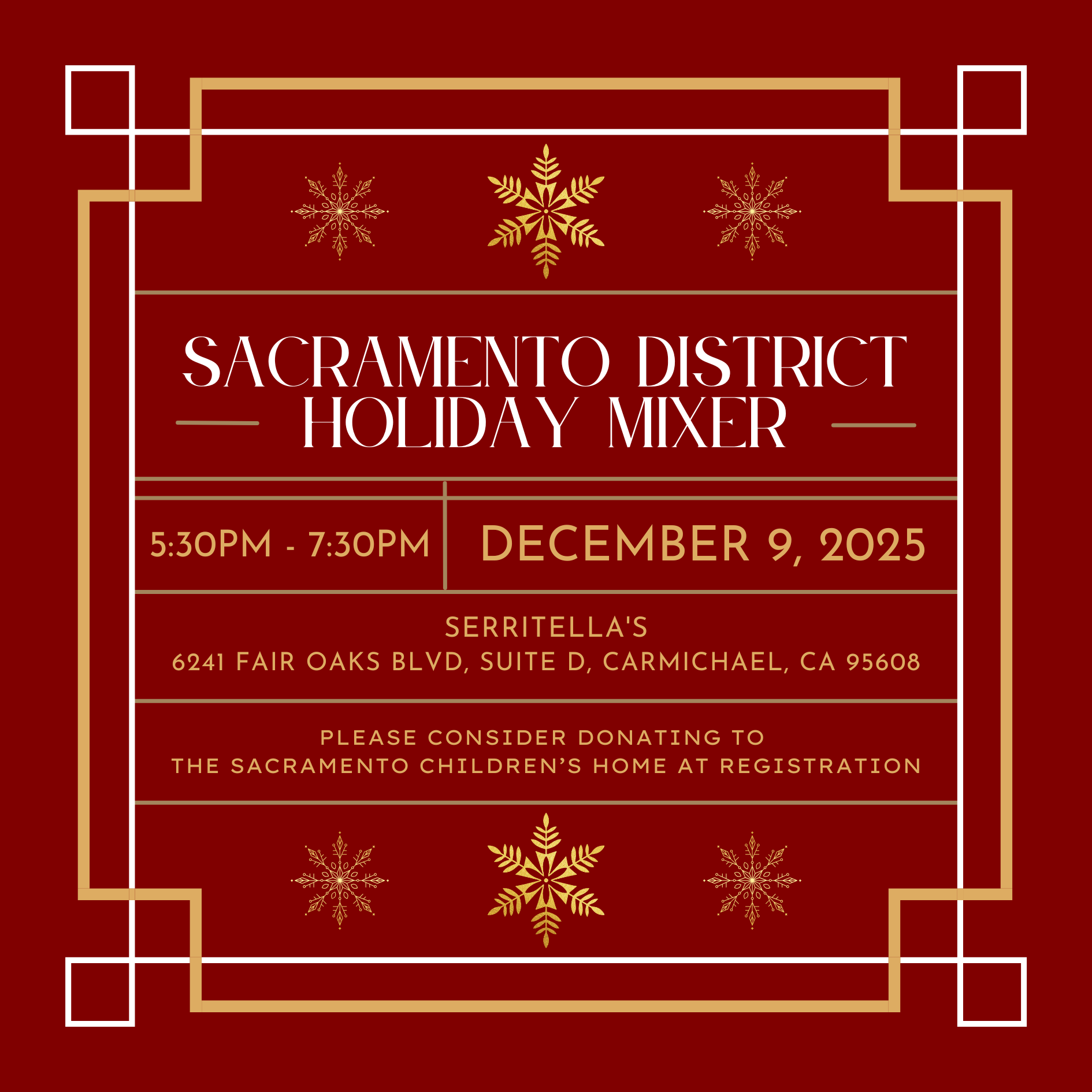 Join us for the Sacramento District’s final gathering of the year as we celebrate the season, reflect on another successful year, and look ahead to the exciting changes to come.